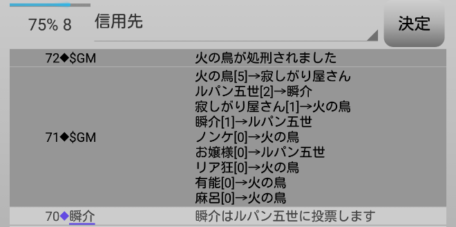 瞬介「議論はここで終わり。投票の時間になります。投票宣言はされていないけど暗黙の了解でみんな火の鳥投票をするのかな?俺は対抗のルパン投票です」