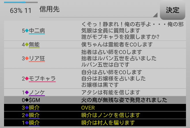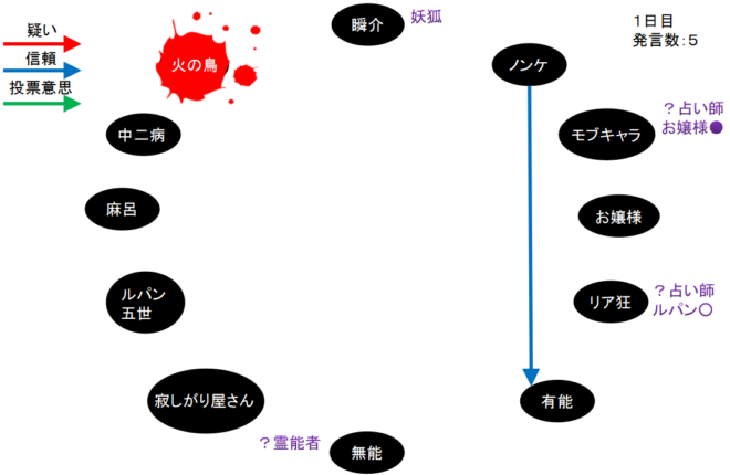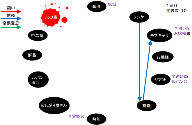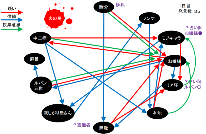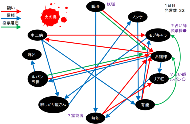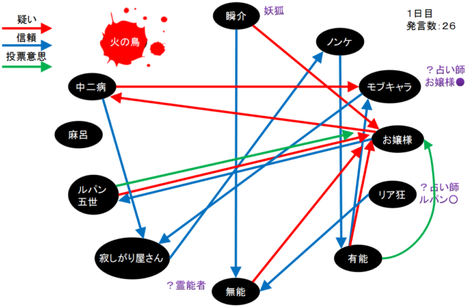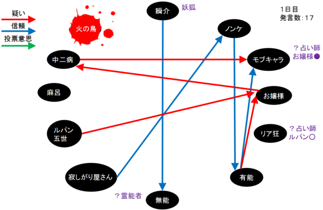 瞬介「初日犠牲者は火の鳥か。冒頭で見た悪夢と同じだな。不思議な偶然もあるものだ。さてさて、今回も騙り占い師をやろうかな?それとも潜伏妖狐をしようか?」