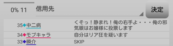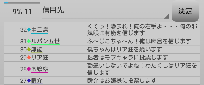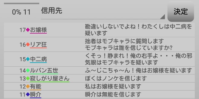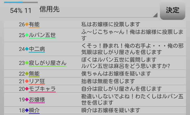 占い師COをした方が良かったとは思う。しかし騙り占い師は狂人プレイで散々やったからね。このまま潜伏で勝利を目指そう。真(?)のリア狂からお嬢様をどう思っているか質問が来ているが占い師には触らない方が良いだろう。『真霊能者の無能を信頼しています!』」