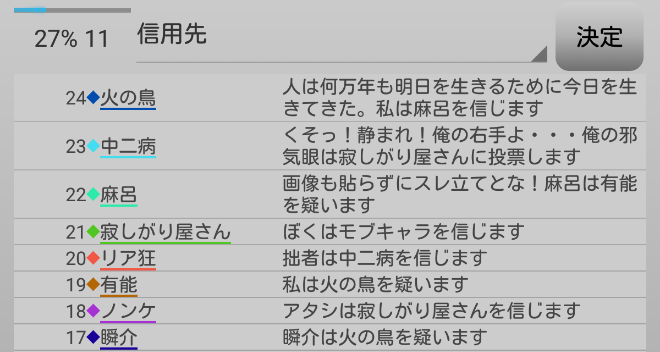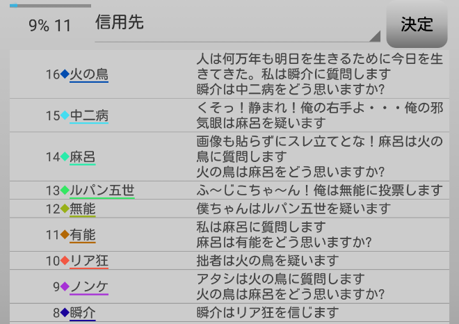 さて?そろそろ誰かに投票宣言でも飛ばそうかな。狂人火の鳥が信頼しているという理由で「麻呂」へ投票宣言だ。有能あたりも吊りたかったけど奴は俺と同じく火の鳥疑いなんだよね。