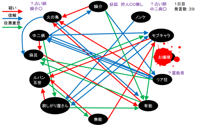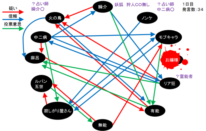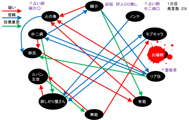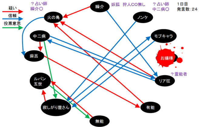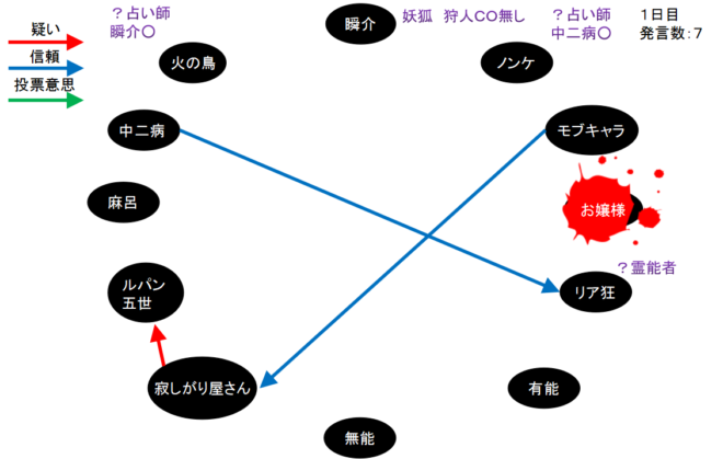 瞬介「初日犠牲者は寂しがり屋さんか。なんだかんだと彼は役職を持つと見せ場を作ってくれるプレイヤーだね」