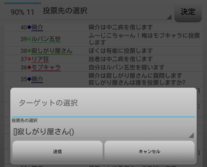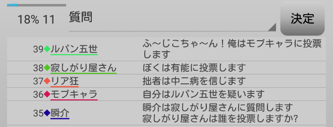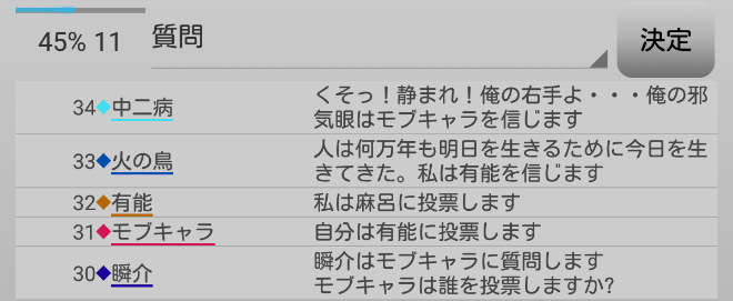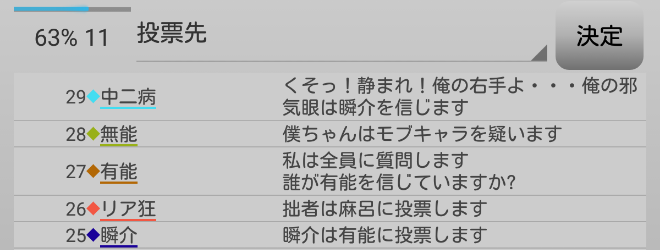 瞬介「今回は票がまとまらない気がする。投票意思を示していないグレーへ質問をしよう。『モブキャラは誰に投票しますか?』」