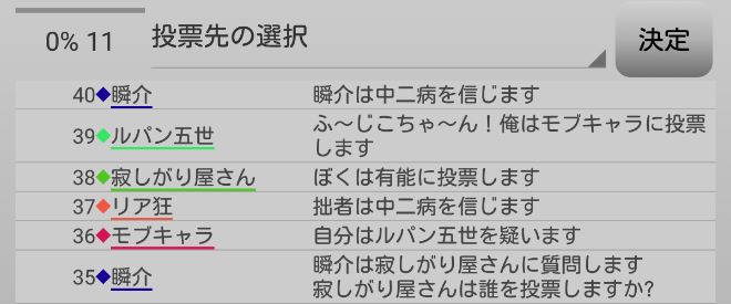 瞬介「議論はこれで終わり。投票の時間になります。ふざけてノンケ投票をしてワンチャンス真占い師吊りを狙いたいけど(笑)。再投票をめざして寂しがり屋さんに投票をしてみようか」