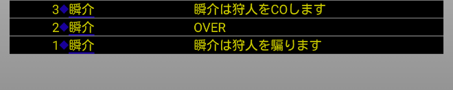 瞬介「狩人を選択した後に『次のステップまで進める』ボタンを押して1日目のCO結果を見ます。ここで偽○を出されなければ『終了』ボタン→『再試合』を選択でCO結果を厳選できるようです」