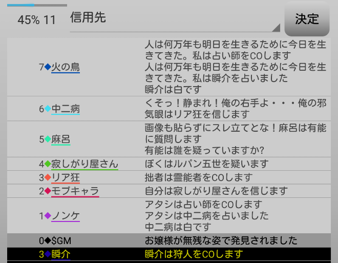 瞬介「さっそくグレー達が信じているだの疑うだの騒いでいる。俺も仲間に入れてもらおう。『霊能者のリア狂を信じています!』」
