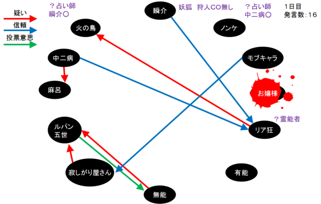 火の鳥は狂人占い師、ノンケが真占い師で中二病○、リア狂は真霊能者だろう。グレーの『モブキャラ、有能、無能、寂しがり屋さん、ルパン、麻呂』の中に人狼が2匹いるわけか。このまま人狼が潜伏を選んだら妖狐にとって有利だと思う(グレーが多いのでそう思った)。