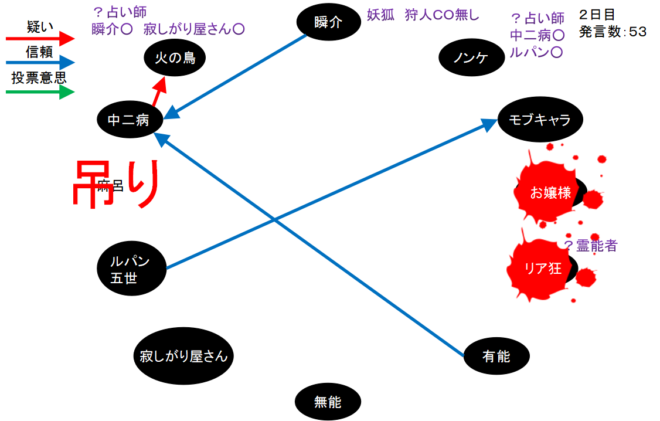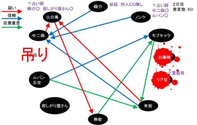 火の鳥の寂しがり屋さん○は気になるね。人狼っぽいプレイヤーに○を出そうと勝負をしたような印象を受ける。グレーは『モブキャラ、有能、無能』。この中に人狼がいれば2日目吊りか3日目真占い師●出しの対象になるんじゃないか。