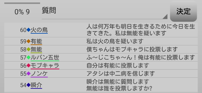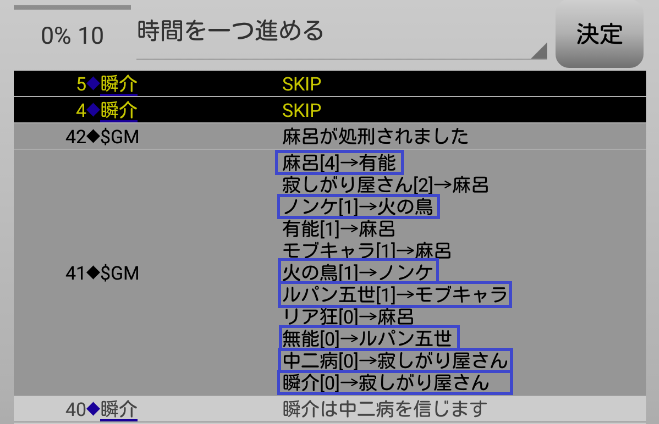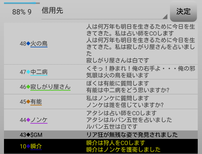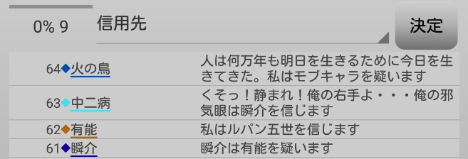 瞬介「狂人火の鳥の疑い先を注目するのは重要かもしれない。火の鳥は推理力のあるプレイヤーなので『モブキャラ○、無能○』だったりするのかも。今日はこのまま有能吊りだな」