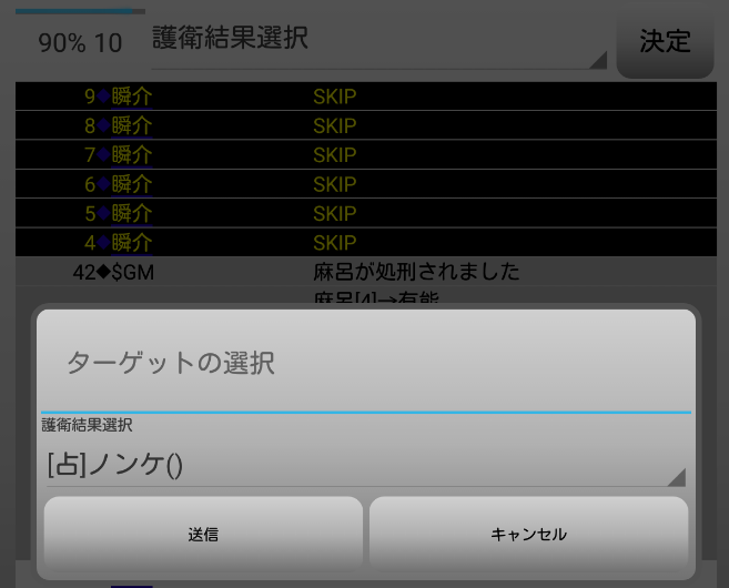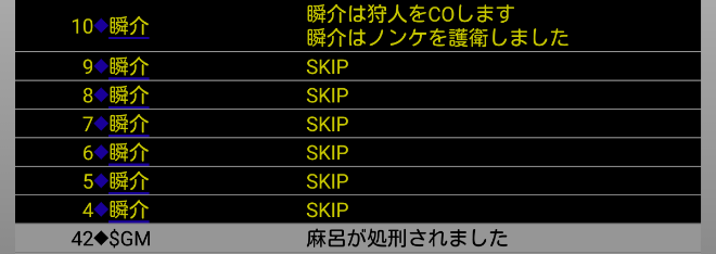 瞬介「偽護衛結果は真占い師のノンケ護衛だ。真狩人は霊能者を護衛しているだろうが、わりと霊能者噛みは成功するから。真からの信頼を稼ぐ意味でも破綻しない占い師護衛をしておこう」
