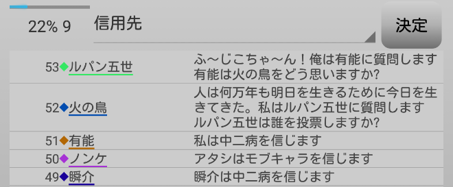瞬介「有能に質問したいけど、今度はルパンが有能に質問をしている(笑)。有能は村から人外だと思われており、事実人狼なのではないか?有能●だとぶった切ってしまうとして(笑)、今日は有能を生かすべきか吊るべきか?生かせば明日は2人の占い師が有能を占って火の鳥が破綻するかもしれない。そうだ、注目されている有能を生かせば3日目にモブキャラがグレーとして残るかもしれないな」