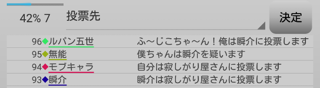 瞬介「もう有能●の線で議論を進行して良いと思う。間違っていても人狼の圧勝になり妖狐勝利だろう。投票結果から有能の相方人狼は無能と断定できる」