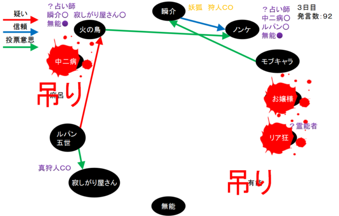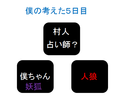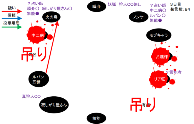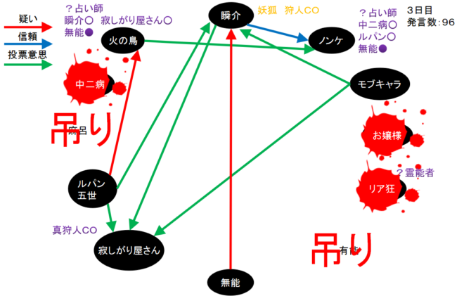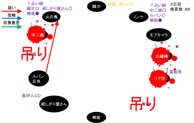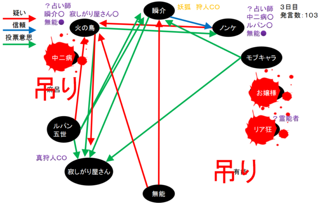 別の事を考えよう。明日の噛み先が俺になり村人が減らなかったとする。するとピンチになるのかな?また2日目投票直前の図を貼ります。