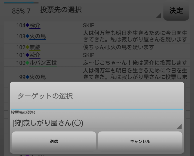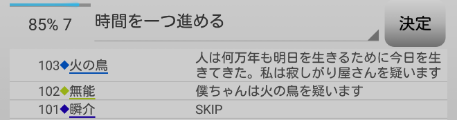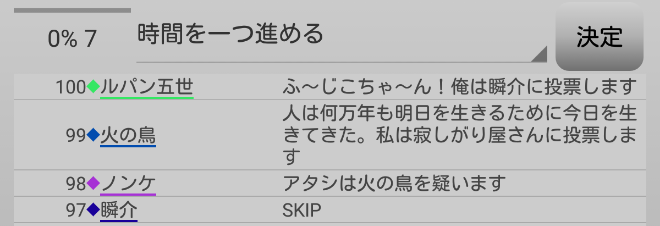 瞬介「ちくしょう!無能の野郎が俺を疑っている!奴は協調性が低く設定されているので多数派(今3票集めている寂しがり屋さん吊り)には乗らないスタンスなのかもしれない。『スキップ』をしておこう。無能が俺へ投票宣言をしたら投票先を質問して無理矢理にでも変更させるしかない」