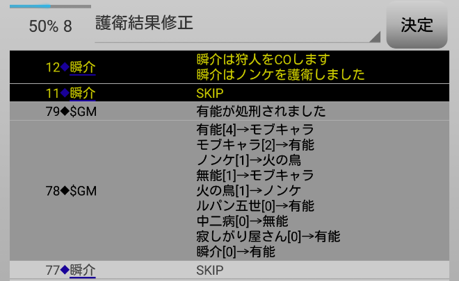 瞬介「うう。無能は占い師投票か(笑)。そして占い師2人が俺を支持した!無能よ!明日は俺を噛め!俺は狩人GJから真狩人を乗っ取る!そしてノンケはモブキャラ占いで呪殺回避というわけだ!・・・明日の4日目は吊り数2回だけどね(泣)」
