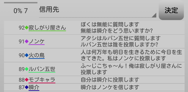 もし生き残れたら明日は真占い師のノンケ護衛だ。運の良いことにLWであろう無能には真占い師の真贋はついていない。さて、ここからどうやって生き残るかだが・・・あれ!?もうルパンとモブキャラが投票宣言をしているから生き残るかどうかは無能しだいなの!?奴に運命を握られちゃっているわけ!?『寂しがり屋さんへ投票します!』」
