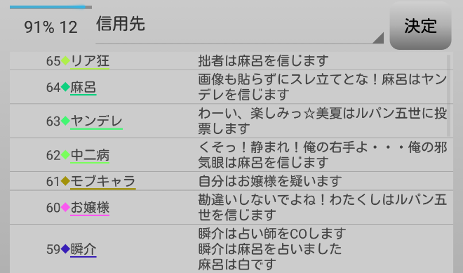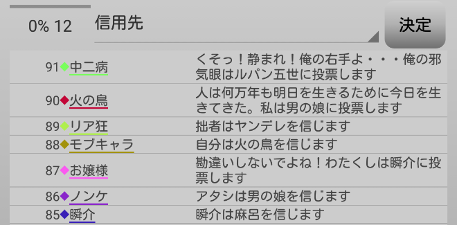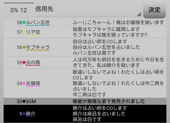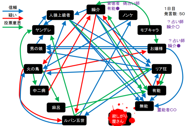 瞬介「赤で囲んだ者は有能以外に投票したプレイヤーです(占い師を除く)。いやあ、俺の●出しを多くの村人が信じてくれたみたいだし絶好調だな!勝つぞー!」