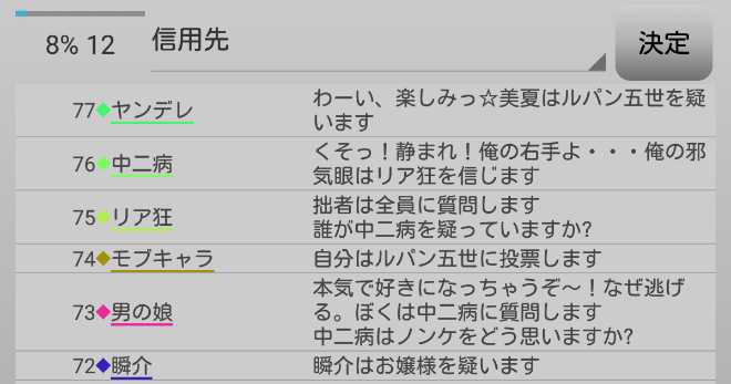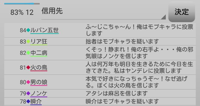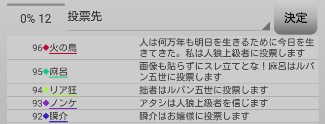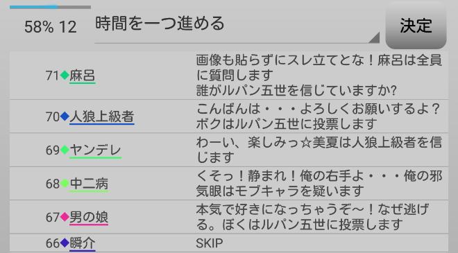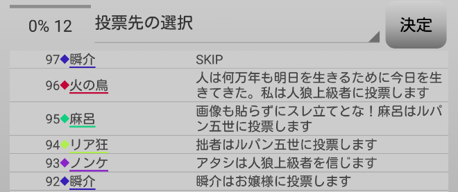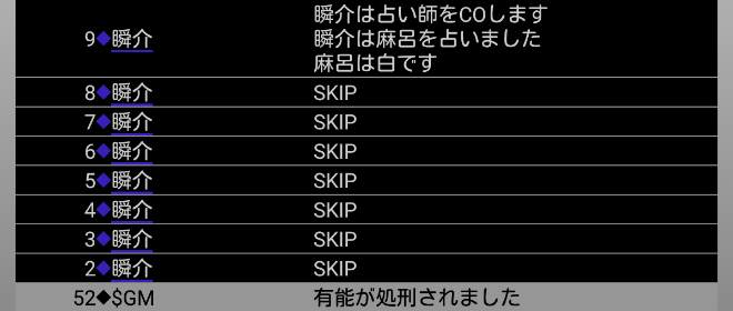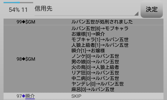 瞬介「妖狐麻呂がルパンへ投票宣言をした。早めに麻呂に信頼発言を飛ばしておいて良かったよ。今のタイミングで信頼をすると対抗モブキャラの●投票まで支持することになってしまうからな。最後の発言になります。『スキップ』をします!あまり発言をし過ぎると逆効果らしいのでね」
