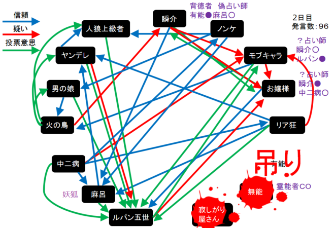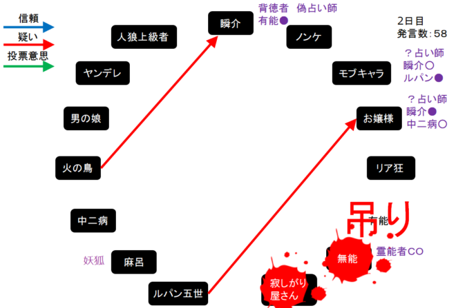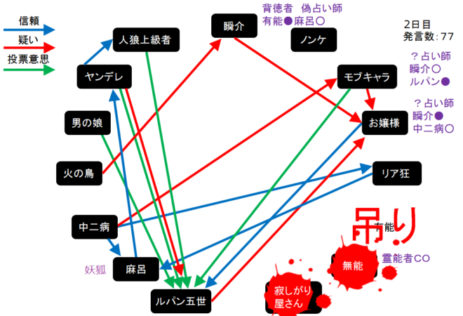 ただ麻呂が信用されすぎているため明日は妖狐噛みが発生するかもしれない。現在、残り吊り数は5回。明日はもう一人の人狼候補者である火の鳥へ●を出してしまおうか。