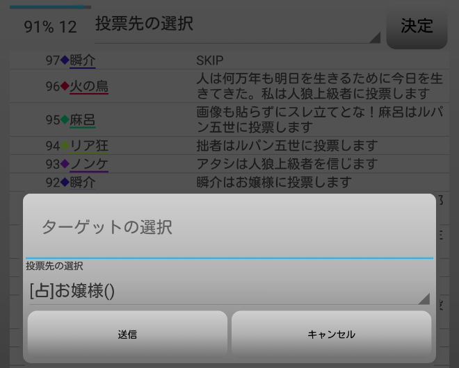 瞬介「本当に真●のルパンが吊れてしまうぞ。何か発言をした方が良いんだろうが、どうしようかな。対抗占い師のモブキャラに疑い発言をしたらルパン吊りが台無しになってしまうかもしれない。だからといって別の対抗占い師であるお嬢様へ疑いを飛ばすのは弱気すぎるか?それならば、占い師2人に疑い発言を飛ばしておこう。『お嬢様を疑っています!』」