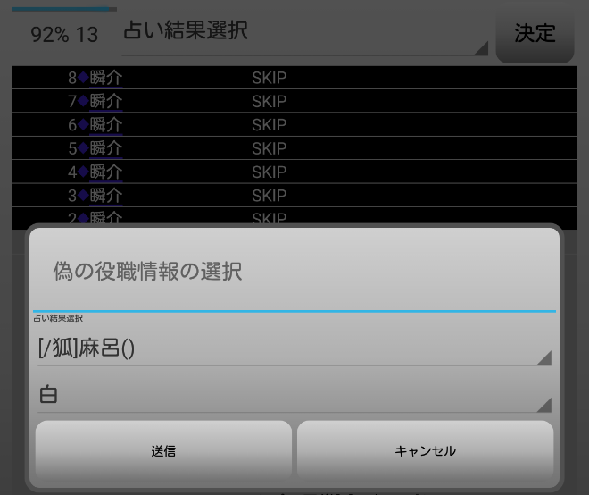 ええと?次はどうしようかな。発言は抑えて『スキップ』をしておこうか。占い師が3人もいる状況でグレーに信頼発言をしても逆に疑われるだけだ。かといって麻呂に信頼矢印を集めると妖狐噛みが怖い。