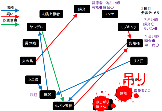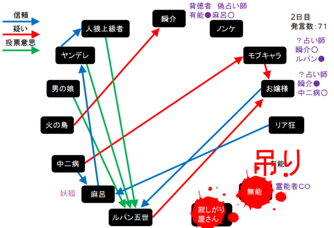 いくら考えても明日麻呂が呪殺されたらゲームは終わってしまう。2日目を始めましょう。それでは2日目よ来い来い!そいっ!