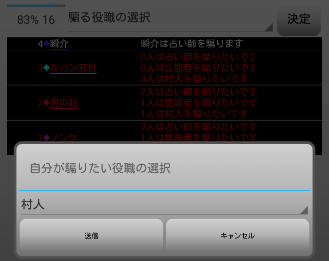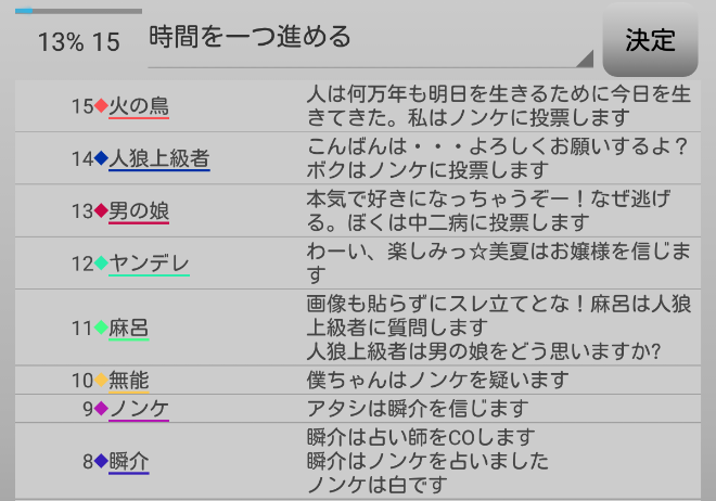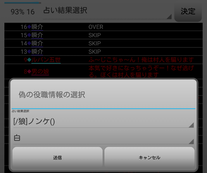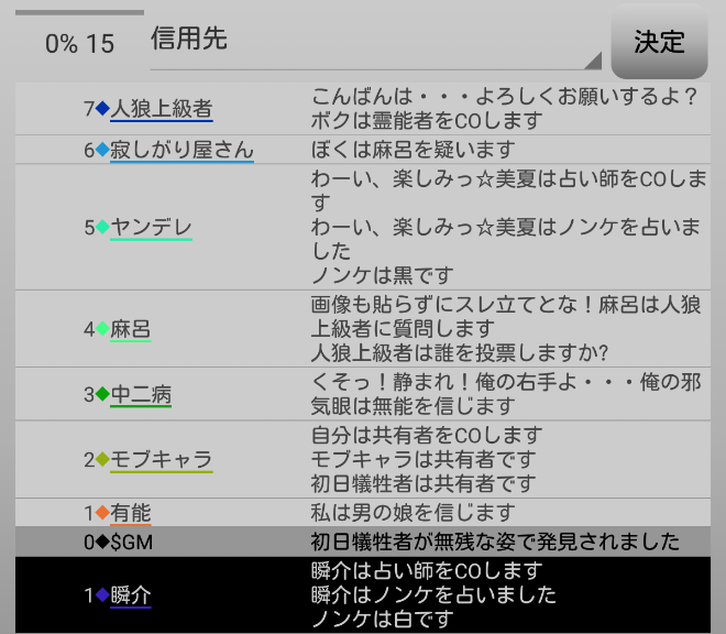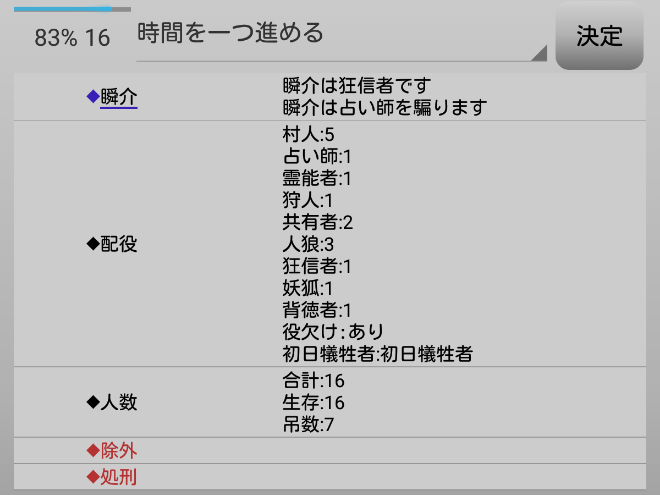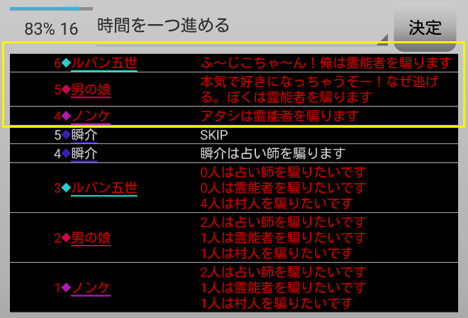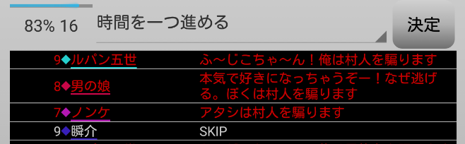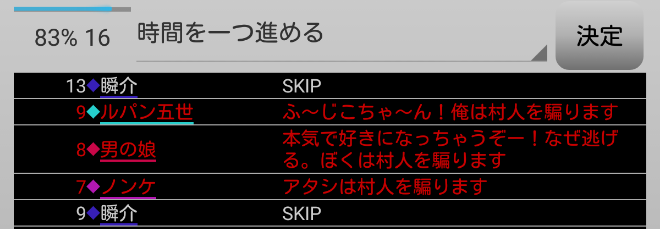 瞬介「偽占い師としてCOすることになったが、騙る役職は再び選び直せるみたいだ。慎重に時間を進めながら人狼達の会話を聞いていこう」