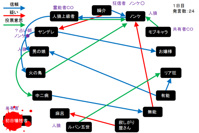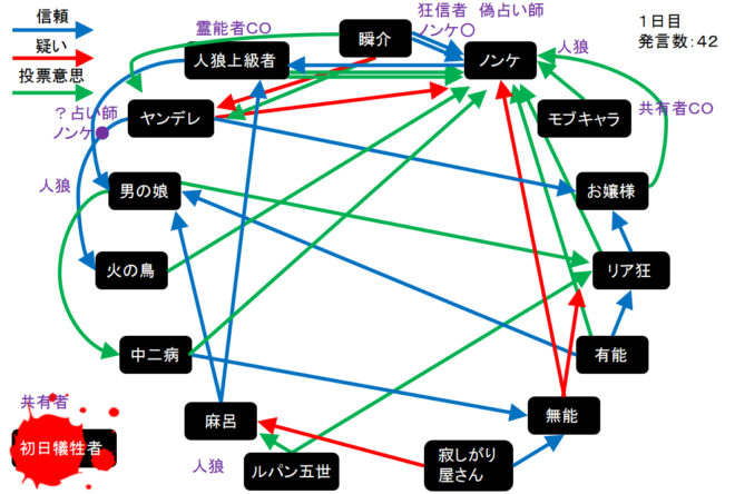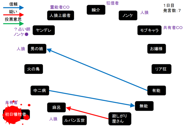 瞬介「役欠けは共有者だ。COをしたタイミングから考えてもヤンデレは真占い師だな。これはまずい開幕となった。仕方ない!『ノンケを占って○でした!』」