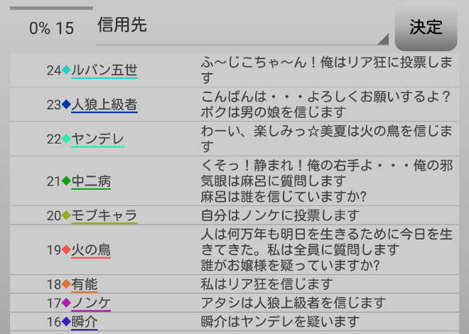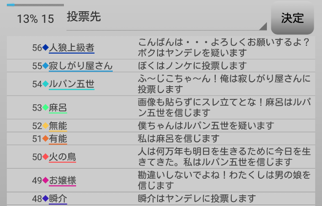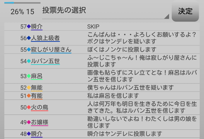 瞬介「人狼達の会話が止まった。どうやら潜伏3人になりそうだぞ。誰に偽○を飛ばすか考えようぜ。自分は『男の娘』や『ノンケ』は強いプレイヤーだという印象があります。ノンケは『僕の16D村』で最強のプレイヤーなんじゃないかな。この2人はAIに好印象を与える局面が多くみられたので真占い師から目をつけられることはそんなに無さそうだ。となれば協調性の低いルパンに○を飛ばしておくか?」