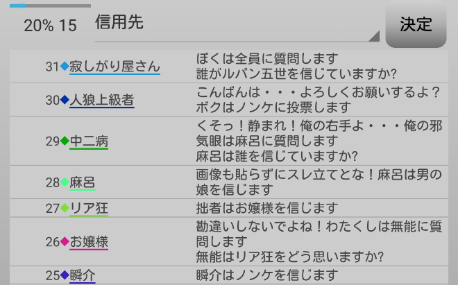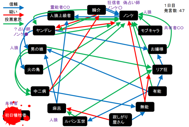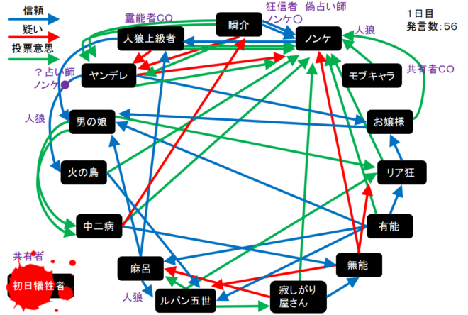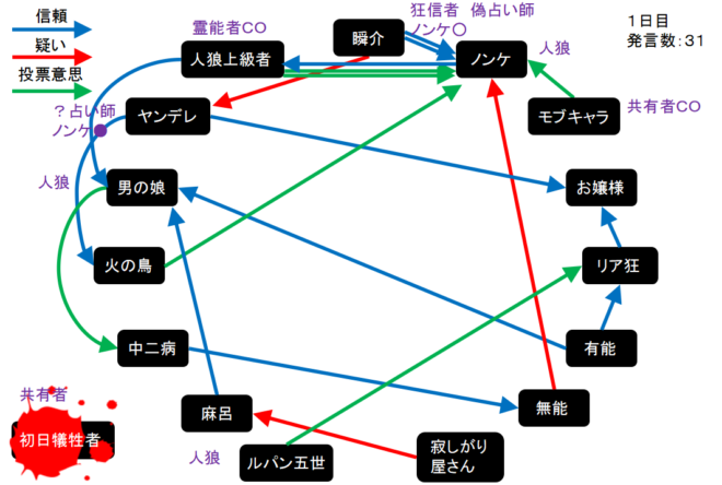 瞬介「有能が男の娘やルパンを信頼しているのはなぜなんだろう。他に真霊能者とか信頼に足るプレイヤーがいると思うのにな。お嬢様が発言を少なめに抑えており、そのお嬢様を信頼するリア狂も謎だ。怪しいプレイヤーは散見されるけど投票結果で人狼の正体がバレバレになるから気が滅入りますよ」