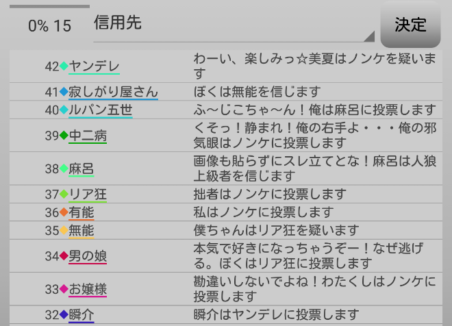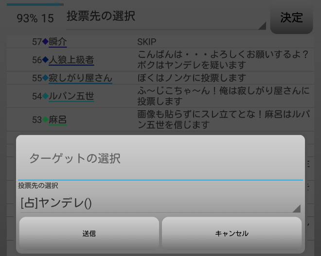 対抗占い師の『ヤンデレへ投票宣言』をしておこう(間違えて2回目)。できることはそれくらいしか思いつかない。