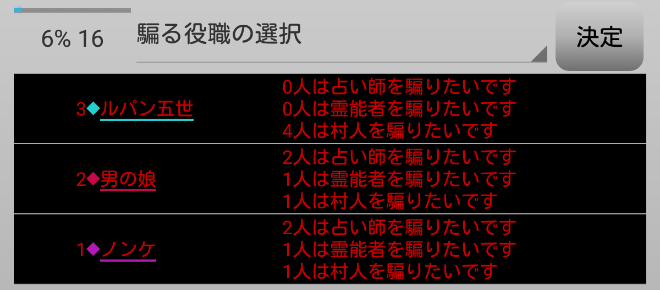 ルパンは協調性がめちゃめちゃ低いので、ゲームが開始していない現段階でも信頼値は下位クラスだろうね。1日目に偽○を飛ばしたは良いが真●と重なり白黒パンダとなるかもしれない。そして吊りになれば霊能結果で俺が破綻する。ならば?安全策をとってノンケ○のCO結果を作ろう。