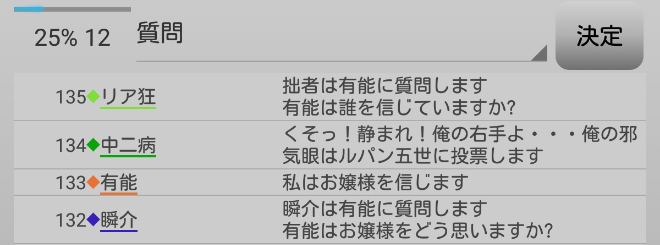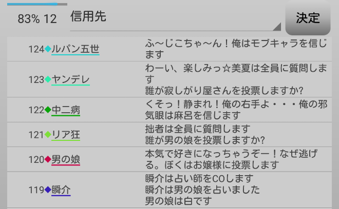 真霊能者がいたら、もう負けていたじゃないか。何か発言や質問で出来ることはないかな。真占い師ヤンデレの占い先を誘動するには?ヤンデレを疑っている者がいないか質問をしてみよう。『誰かヤンデレを疑っている人はいませんか?』。