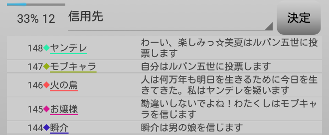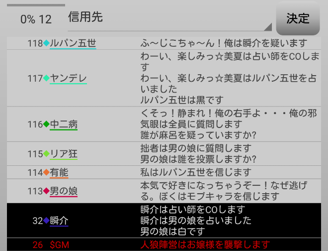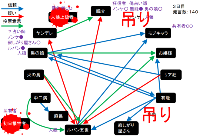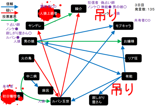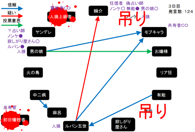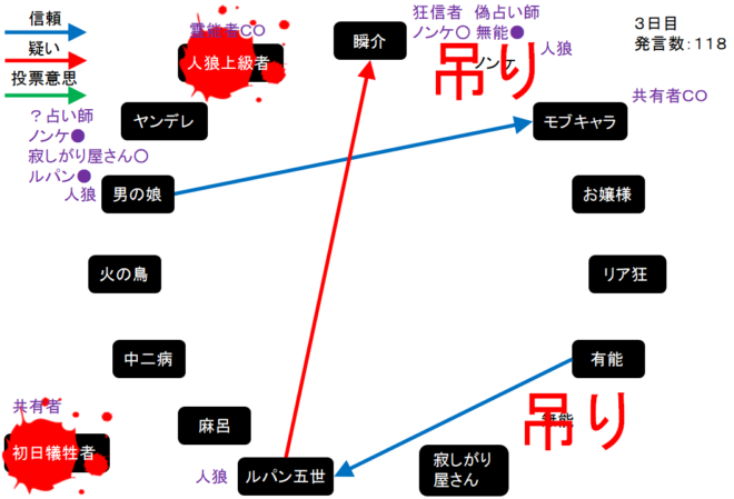 瞬介「この3日目で村人が●を出されたルパン投票に踏み切らなかったら嬉しいな。まあそれはありえないか(笑)。くっそー!占い結果○だった『男の娘を信頼』します!」