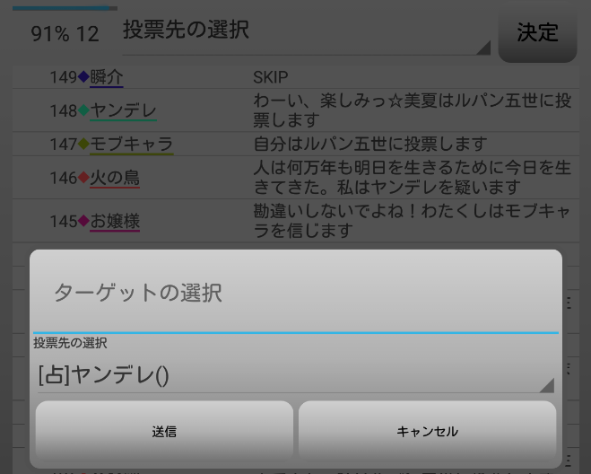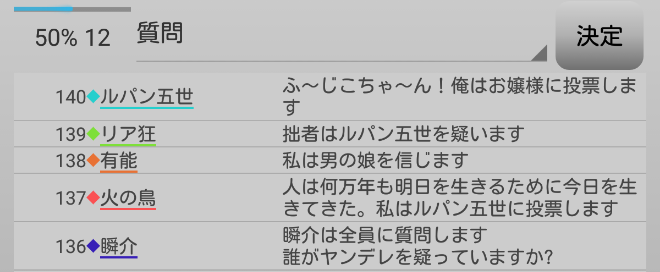 ルパンがお嬢様に投票宣言をしたな。同じことをしている男の娘にも言えることだが、いきなりグレーへ投票宣言した2人を村人達はどう思うのだろう(笑)。そんなの決まっているだろ!人狼だと思うに決まっているじゃないか!僕は対抗占い師の『ヤンデレへ投票』します!
