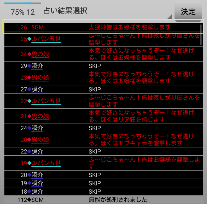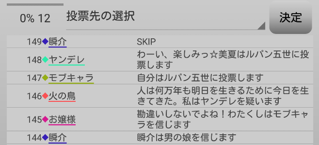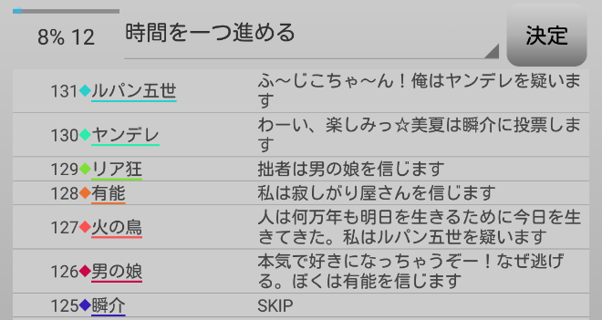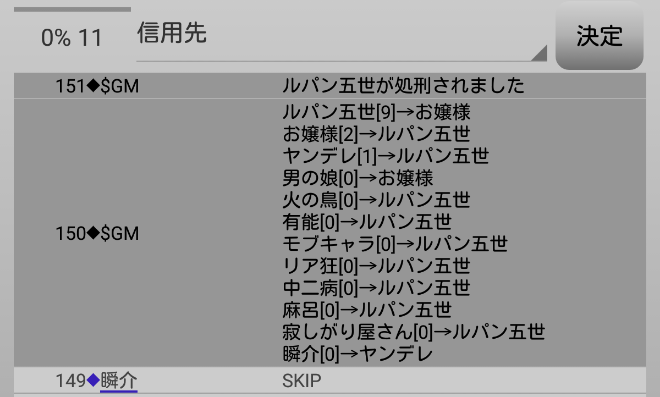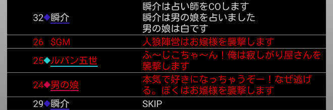 瞬介「占い師から●が出たのでルパン吊りは避けられない。反撃は明日からだ。最後の議論になります。『スキップ』します!」