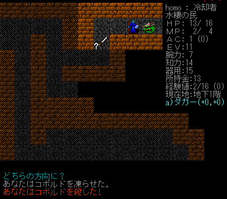 氷の魔術によりコボルドを倒しました。うーむ、楽しい(笑)。私は魔法使いでプレイをするのが好きなのです。