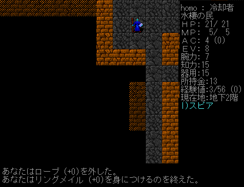 落ちていた鎧(リングメイル)を装備してみるとACが3上がりEVは3下がったのかあ。最序盤に限れば悪くはないのかな。氷結は接近しないと打てませんからACの上がるリングメイルを装備するのはアリかもしれない(たぶん)。