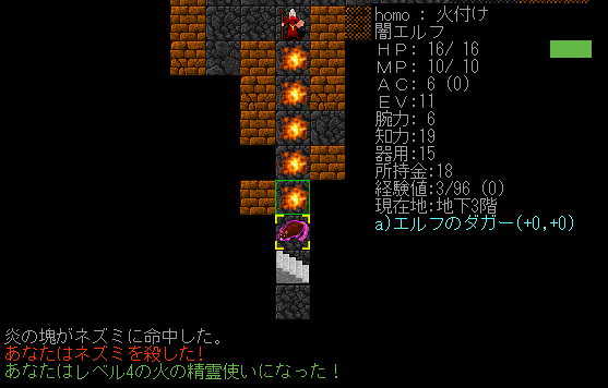 『闇エルフ炎の精霊使い』は難しいことをしなくても遠距離魔法を唱えていれば連戦連勝。それに敵発見、即殲滅ですから探索もサクサクと進む。MPも高いから多くの敵が出現をしても怖くはない。