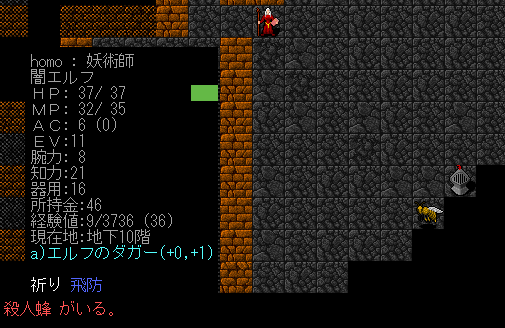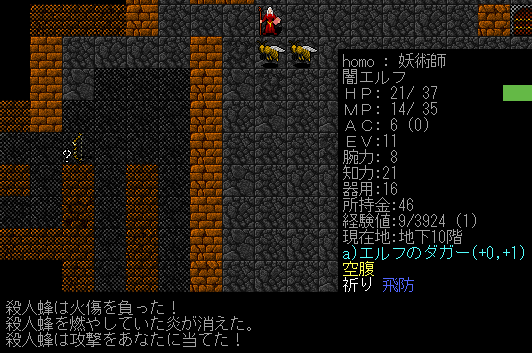 あちこちに点在をする殺人蜂を駆除していきます。蜂やオークに殺されかけて自信を喪失しながらの探索。次の階で死ぬんじゃないかな?もう危機回避の物資がないのですよ。