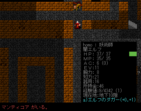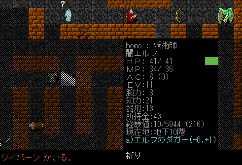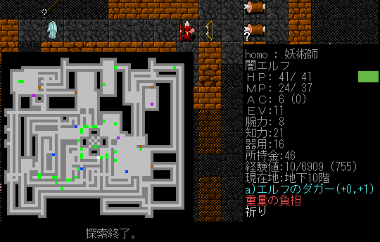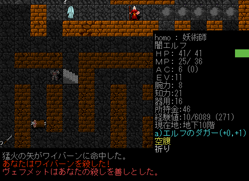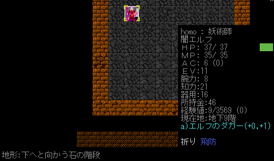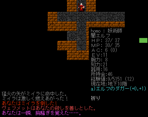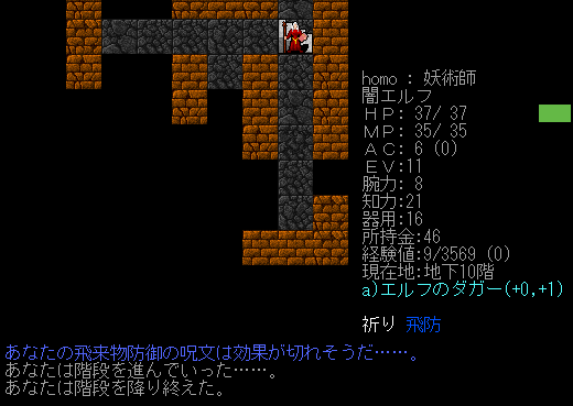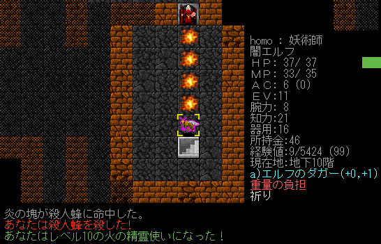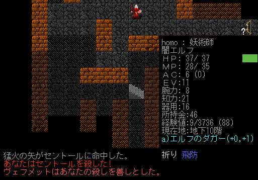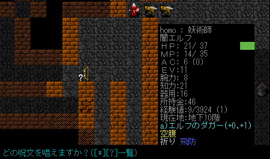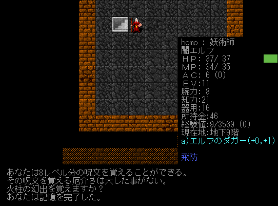 Dungeon Crawlのプレイ日記を始めます。闇エルフ炎の精霊使いをプレイ中です。地下9階の探索が終了しました。『獣の棲み処』の入り口は見つからないものの、敵をサクサク倒せて順調。魔法使いは強いですね!