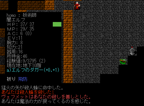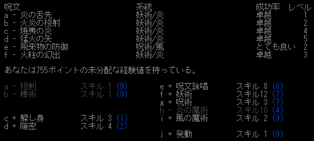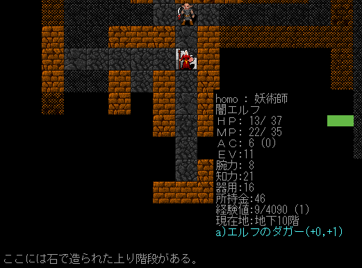 自信を失い泣き言をほざきながらプレイを続けて地下10階の探索は終了。辺りに屍、もとい肉が散乱しております。スキル経験値が755も貯まっている。これを全て『躱し身スキル』に振りたい!動物の召喚を覚えていればできるんだけどなあ(泣)。プレイが雑になっているから中断をします!