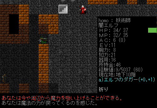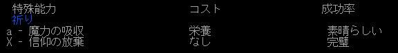 『魔力の吸収』を使えるようになっていますね。『a』ボタンで使用が可能です。魔力の吸収でMPを回復させても信仰値は消費させません。空腹になるだけです。祈祷のスキルが影響をするらしいから、チャンスがあればスキルを上げていきたい。