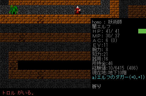 トロルと初遭遇をしました。なぜかこいつの姿を見ると気分が高揚してくる。たしか皮を装備しながら巻物を読めば鎧を作れたはずだ。昔の自分はトロルの皮を欲しがっていたのだろうか(笑)?