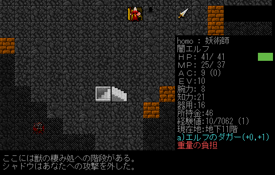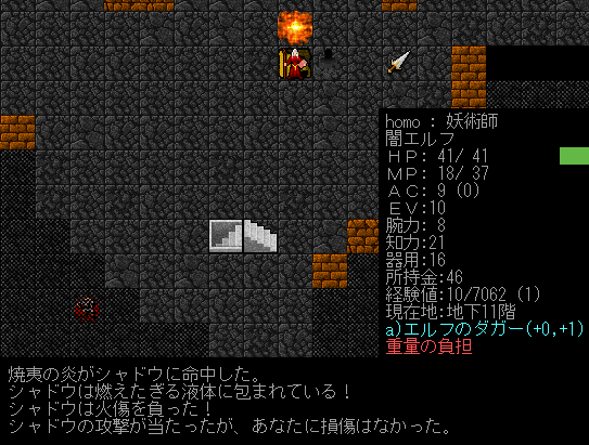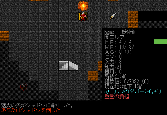 画面右に猛火の矢を撃ってシャドウを撃破しました。私のシャドウ戦は茶番でしたが(笑)、Dungeon Crawlは見えない敵に襲われて死ぬのも珍しくない(私は)。これまで透明の敵に襲われなかったのは運が良かったのです。