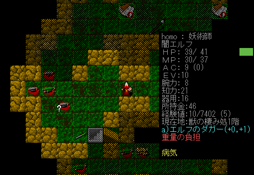 ACは3あがり9になりました。あまり強化された実感はありません。EV(見躱し?)が10に下がったしね。トロルの革の鎧に備わっている『再生』に期待をしよう。空腹になりましたが横にワイバーンの肉が腐るほどあるから食べます。