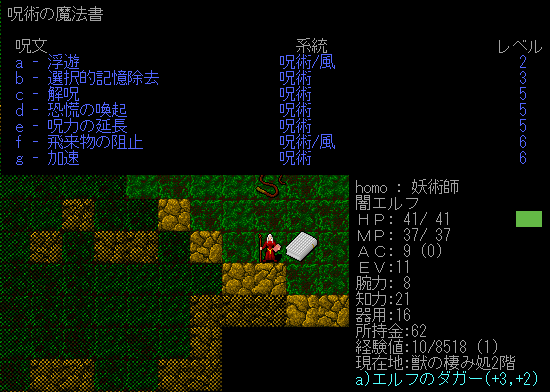 ここからは探索と鑑定と持ち物の整理を繰り返していました。獣の棲み処2階にて呪術の魔法書を入手。書かれている呪文を見てみると?便利な魔法ばかりある!これは素晴らしい魔法書だあ!消費していた物資も増えてきたし良い感じです。