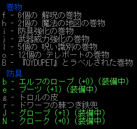ついに焼き討ちの巻物を鑑定しました。こいつを見つけていなかったから未鑑定の巻物を1枚つずつ持って読んでいたのです。拷問の巻物はまだ拾っていません。残念ながら獲得の巻物もない。