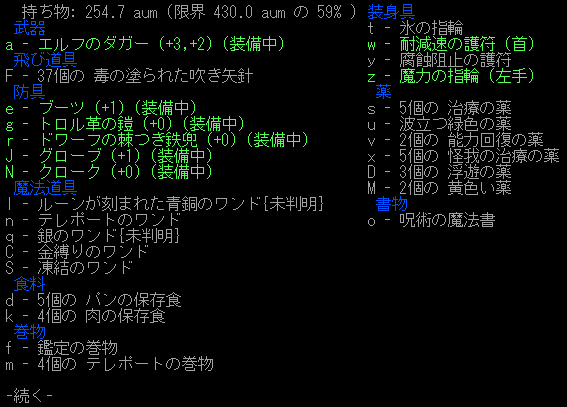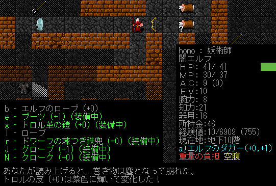 さきほど遭遇をしたトロルから『トロルの皮』を得ることができました。こいつを装備して防具強化の巻物を読むと『トロル革の鎧』に変化をします。トロル革の鎧は『再生』の能力があるらしい。あとは放置していた鉄兜を装備します。