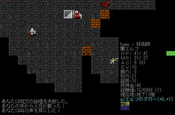 上の画像は地下11階に降りて猛火の矢の詠唱に失敗したもの。空腹になっているし危ないですね。このあとは無事に火炎魔法で敵を葬りイモリ(?)の肉を食べました。リアルで混乱をしていたのかな?プレイが雑すぎる。