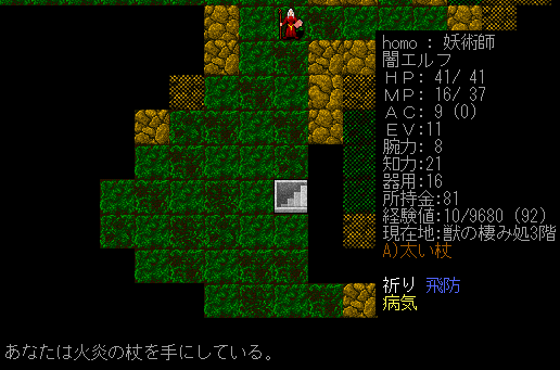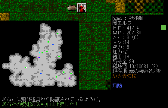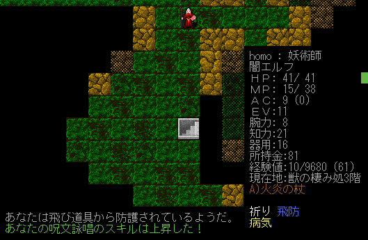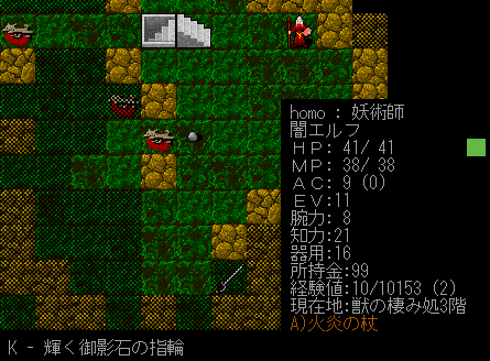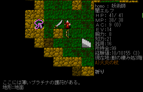 魔法を唱えていたら装備中の杖が鑑定されました。なんと正体は火炎の杖。こいつを装備していると火炎魔法の威力が上がります。火の耐性を得ることもできる。さらに杖でぶん殴ると炎の追加ダメージが加算されたりします。獲得の巻物を読んでいないのにピンポイントで欲しい杖が手に入ったなあ!